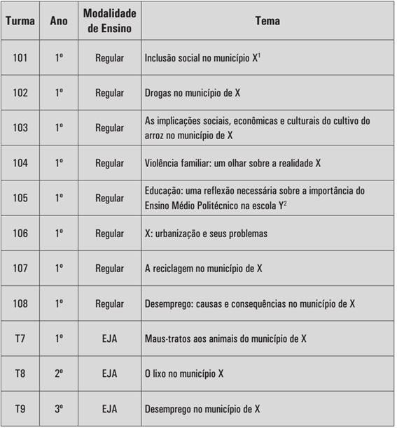Não se pode esquecer que essa mudança curricular foi fruto dos temas trabalhados pelos professores, tanto no primeiro ano do Ensino Médio regular ("A inclusão social no município X"; "Drogas no município de X"; "As implicações sociais, econômicas e culturais do cultivo do arroz no município de X"; "Violência familiar: um olhar sobre a realidade X"; "Educação: uma reflexão necessária sobre a importância do Ensino Médio Politécnico na Y"; "X: urbanização e seus problemas"; "A reciclagem no município de X"; "Desemprego: causas e consequências no município de X"), como na EJA ("Maus-tratos aos animais do município de X"; "O lixo no município X"; "Desemprego no município de X"), conforme mostrado no Quadro 2.