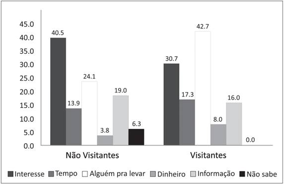 A assiduidade, medida pela assistência aos eventos por mais de cinco vezes ao ano, é muito baixa, com exceção de cinema. Em torno de 45% dos alunos visitantes frequentam cinema com essa intensidade e 36% dos não visitantes. Para as demais atividades, a proporção é pífia, conforme registrado na Tabela 3. Quando perguntados sobre a razão da não frequência a atividades culturais, 40,5% dos não visitantes informam falta de interesse contra 30,7% dos visitantes. Para os visitantes, 42% alegam falta de responsável para acompanhá-los no evento cultural. Esses achados demonstram, ainda que de forma indireta, preferência revelada por atividades culturais para visitantes em relação a não visitantes (Gráfico 8).