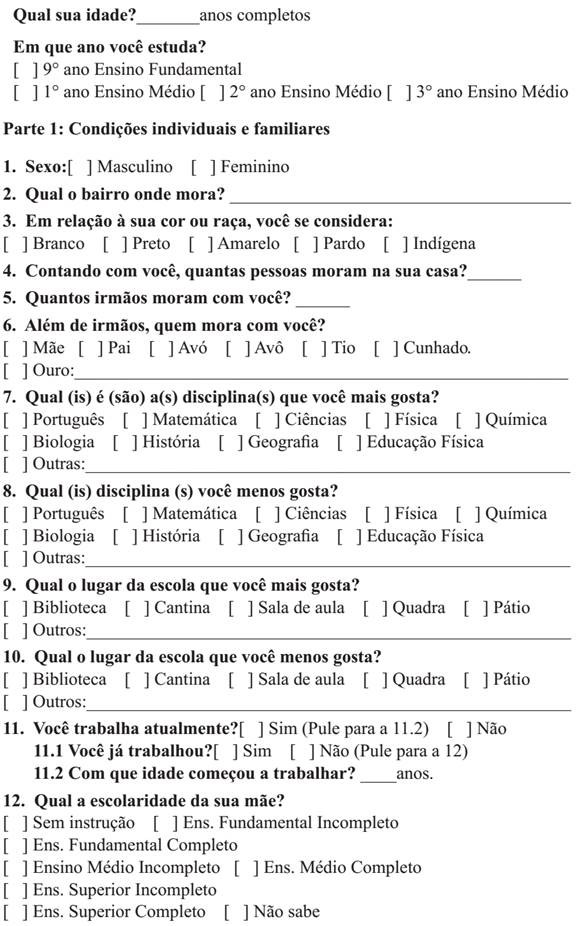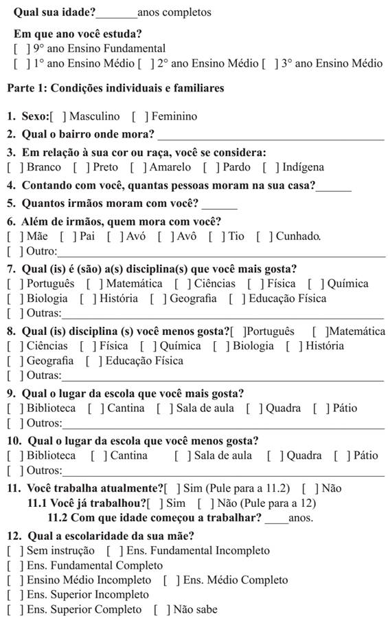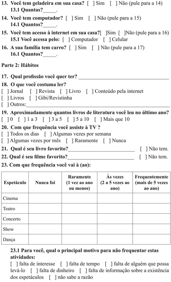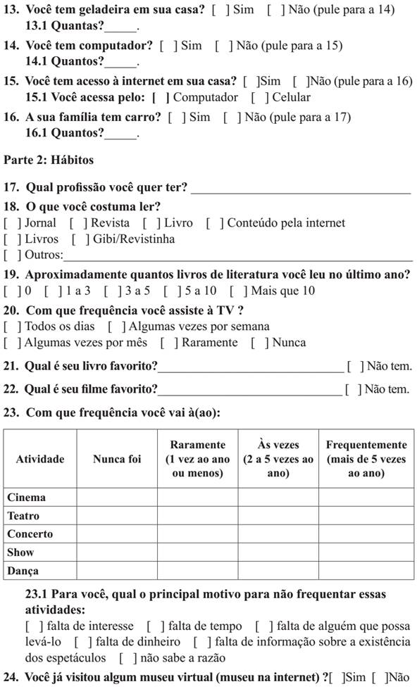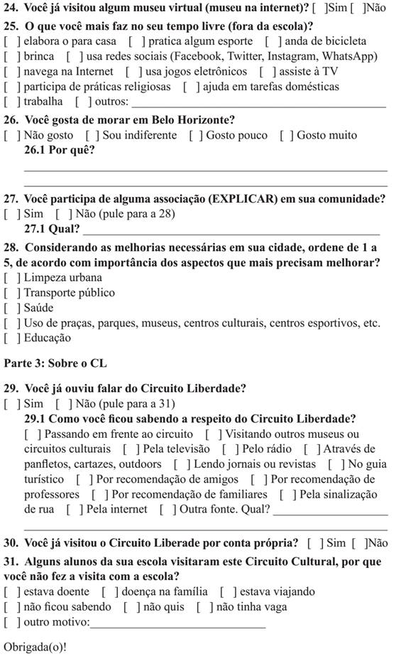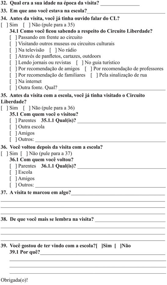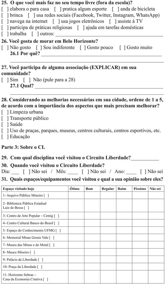 Foram dois os tipos de questionários aplicados (Anexos A e B). O mais sintético, direcionado aos alunos que não visitaram o Circuito Liberdade, traz perguntas referentes ao perfil demográfico dos alunos, às preferências por disciplinas e lugares dentro da escola, às condições socioeconômicas da família, a hábitos culturais, à alocação de tempo livre, à avaliação de Belo Horizonte e de seus problemas, às razões de não ter visitado o Circuito Liberdade. O questionário extenso - voltado para os alunos que fizeram a visita - incorpora todos os módulos acima citados, além de um sobre a visita e seus possíveis impactos, perguntando quais espaços conheceu, sobre a avaliação desses locais, a idade à época da visita e a série que frequentava, se já conhecia o Circuito Liberdade antes de ir com a escola, se voltou depois da visita e se a ela tinha deixado alguma marca, entre outras questões.