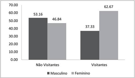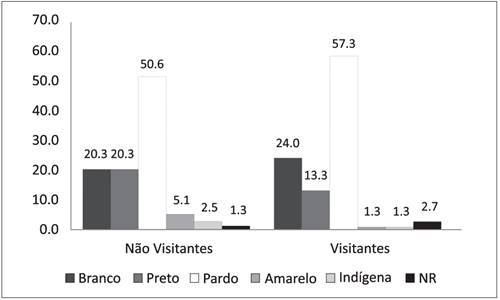 Entre os entrevistados, 84 são do sexo feminino e 70 do masculino. Ainda que a distribuição seja uniforme por gênero, observa-se a prevalência de alunas no conjunto dos visitantes (62,67%) e, entre os não visitantes, a de alunos do sexo masculino (53,16%), de acordo com o Gráfico 1. Já em relação à cor ou raça, mais da metade dos alunos (entre visitantes e não visitantes) se declaram pardos (Gráfico 2).