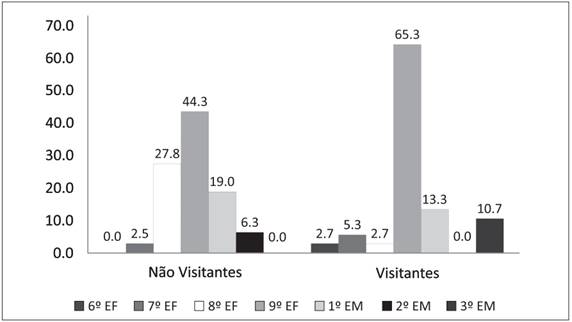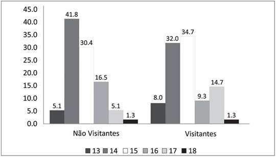 Do Gráfico 3, são apreendidas as informações sobre a distribuição de alunos por idade. A média é de 15 anos, no caso de visitantes (14,78 anos) e para não visitantes (14,94 anos), mas há variação entre 13 e 18 anos. Mais de 50% dos alunos se encontravam no 9º ano, quando da visita, e cerca 16% cursavam o 8º ano do Ensino Fundamental, mesmo percentual de alunos do 1º ano do Ensino Médio (Gráfico 4). É possível afirmar, portanto, que temos uma amostra relativamente homogênea em termos de idade e escolaridade.