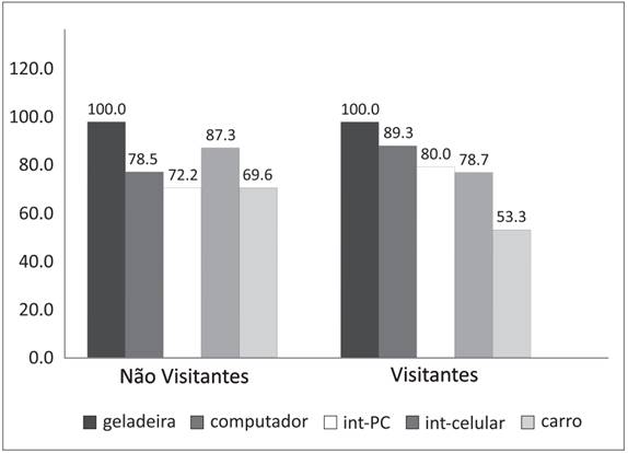 Considerando-se a distribuição de ativos nos domicílios dos alunos - geladeira, computador, internet no computador, internet no celular e carro - para os dois grupos de alunos, verifica-se que a totalidade de visitantes e não visitantes possui geladeira. O acesso à internet também se mostrou disponível para a maior parte dos estudantes, embora, nos domicílios dos visitantes, a proporção de computador e de internet interligada seja superior se comparada à dos não visitantes. Por outro lado, nos domicílios destes últimos, o percentual dos que contam com carro é de 69,6%, ao passo que, no outro grupo, é de 53,3% (Gráfico 5).