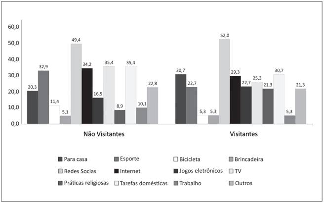 Quando perguntados sobre a alocação de tempo fora da escola, em ambos os grupos, visitantes e não visitantes, a maioria afirmou gastar seu tempo livre em redes sociais, praticando esportes, assistindo à TV, realizando tarefas domésticas, fazendo "para casa" e acessando a internet, conforme descrito no Gráfico 6.