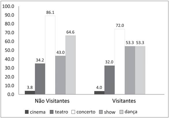 A ausência às atividades culturais fora do lar, tais como filmes em salas de cinema, peças de teatro, concertos, shows musicais e espetáculos de dança, é reportada no Gráfico 7. Quase 80% dos alunos nunca foram a um concerto, sendo maior a parcela entre os não visitantes. Espetáculo de dança é outra atividade pouco frequentada, seguido por show.