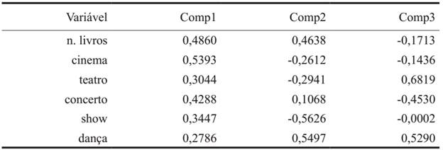 dim1 = 0,4860*cinema + 0,5393*teatro + 0,3044*concerto + 0,4288*show + 0,3447*dança + 0,2786* n_livros