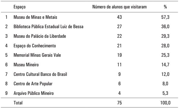 Do total de 160 alunos contatados, 154 aceitaram responder ao questionário. Conforme a Tabela 1, abaixo, a distribuição dos alunos segundo espaço visitado evidencia que 57,3% deles estiveram no Museu de Minas e Metais, seguido pela Biblioteca Pública, 36%. De todos, o menos visitado pelos alunos de escola pública é o Arquivo Mineiro, provavelmente, porque se tratam de crianças e adolescentes e o acervo desse espaço se volta mais à pesquisa documental, historiográfica, bibliográfica e, em grande parte, de cunho acadêmico.