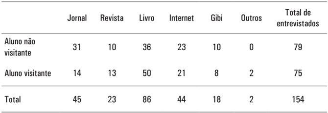 No módulo referente a hábitos culturais, nota-se que 56% dos alunos entrevistados leem livros com frequência, especialmente os visitantes (67%). Em média, os alunos visitantes leem mais (62% leem mais de três livros por ano) que os não visitantes (40,5% leem mais de três livros por ano). Já a leitura de jornais é mais usual entre os alunos não visitantes e ocupa, entre os veículos, o segundo lugar em leitura (Tabela 2). A TV também é um hábito bastante comum entre os estudantes, sendo que 67% deles afirmam assistir à TV todos os dias. Como destacado na seção anterior, o acesso à internet (por computador ou por celular) é uma realidade para a maioria dos alunos, embora navegar na internet não seja identificado por muitos deles como um hábito de leitura. Cerca de 17% desses alunos já utilizaram a internet para visitar museus virtuais.
