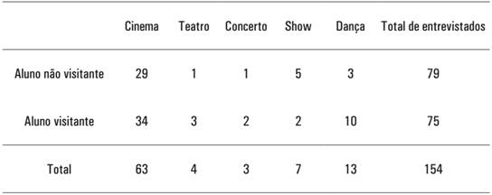 É importante destacar, ainda, os limites da análise quantitativa nesses casos, incapaz de captar a contento a diversidade das experiências estéticas e cognitivas vividas por cada um dos alunos que visitaram os espaços. Some-se a isso a dificuldade de definir o que se trata como cultura. No contexto da pesquisa reportada neste trabalho, ainda prevalece a definição de uma prática cultural atrelada a um perfil de consumidor europeu. Para além dessas atividades, há que se considerar outras manifestações que ocorrem como samba de roda, capoeira, quadrilhas, entre outros.