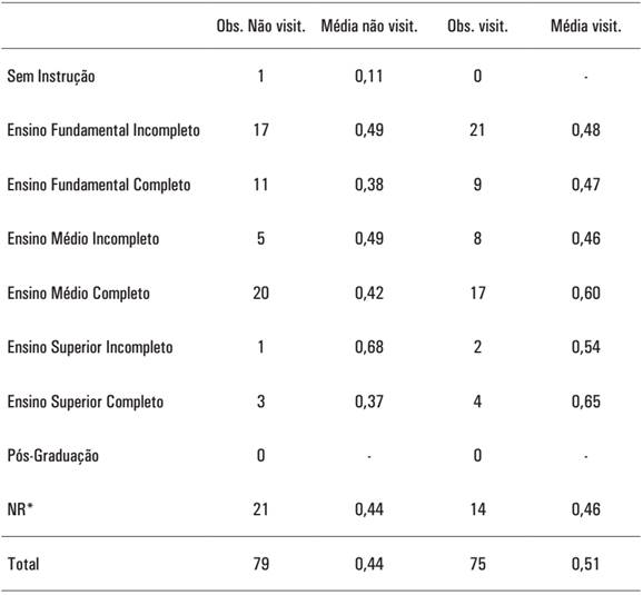 Entretanto, ao se separarem os dois grupos de alunos, segundo a escolaridade da mãe, observa-se que não há uma relação monotônica positiva entre o indicador e a escolaridade. Por exemplo, entre os alunos não visitantes, a média é maior para aqueles cuja mãe possui Ensino Fundamental Incompleto (0,49) comparados aos que a mãe possui o mesmo nível finalizado (0,38). No caso dos visitantes, a relação tende a ser positiva, ainda que os alunos cuja mãe tem apenas o Ensino Superior Incompleto apresentem índice de hábitos mais baixo aos de mães com escolaridade próxima (Tabela 4).
