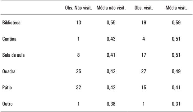 Outro achado interessante diz respeito à relação entre o índice e a informação sobre o ambiente que mais gosta na escola. Os alunos que apontaram biblioteca como lugar preferido são aqueles que detêm o mais alto indicador de hábito cultural para os dois grupos analisados (Tabela 5). Tal pergunta funciona como teste de consistência das respostas dos entrevistados e, nesse caso, a relação é adequada. Ademais, entre os visitantes, sala de aula é reconhecida como espaço preferido para alunos cuja medida de hábito ocupa o segundo lugar.