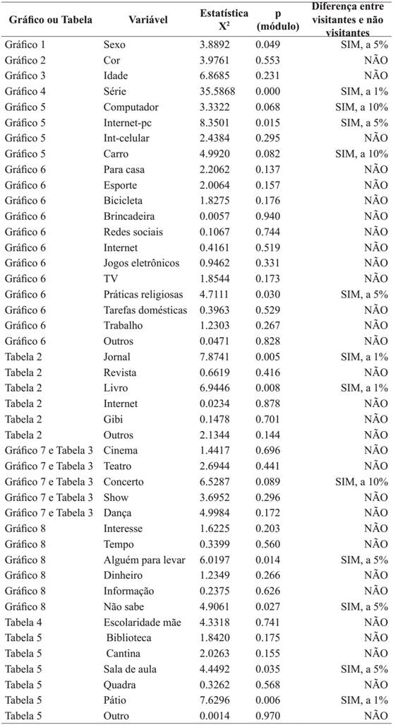 Para as variáveis utilizadas na análise, foram feitos teste de médias e teste qui-quadrado (apresentados no Apêndice), de modo a verificar a diferença estatística entre o grupo de alunos que visitaram o CL com a escola e os que não o fizeram. Verifica-se que há diferenças entre os dois grupos no que tange ao interesse do aluno na escola e aos hábitos culturais formados e cultivados. Provavelmente, essa diferença decorra de um viés de seleção presente na escolha dos entrevistados, pois foram as professoras responsáveis que os designaram para a entrevista. Esse problema não teria como ser resolvido no âmbito desta pesquisa, uma vez que a unidade foi a escola e não o domicílio de residência das crianças e adolescentes. De qualquer maneira, os resultados indicam, na grande parte dos casos, ausência dessas diferenças.