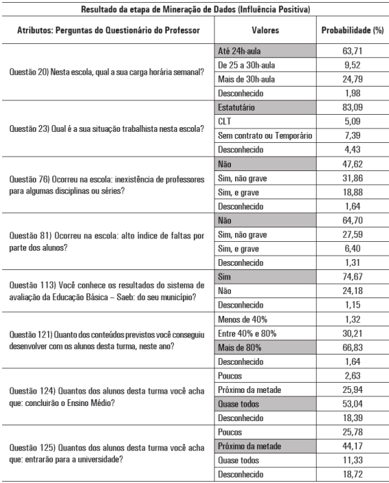 Ao se analisarem os atributos com seus respectivos valores, podem-se observar alguns resultados significativos. Nota-se que o desenvolvimento de um alto percentual do conteúdo originalmente previsto, a frequência regular dos alunos na escola e a inexistência de problemas relacionados à falta de professores favorecem um desempenho positivo dos discentes. Além disso, aparecem como fatores favoráveis a situação trabalhista estável, bem como a carga horária semanal não elevada dos docentes.
