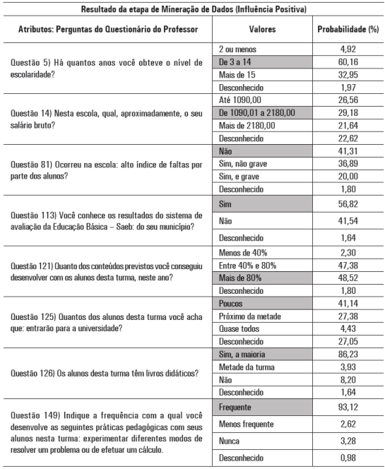 A etapa de mineração possibilitou observar alguns fatores que são favoráveis ao aprendizado de matemática, como alto percentual de conteúdo previsto desenvolvido; assiduidade dos discentes na escola; baixos índices de absenteísmo dos professores; a expectativa, por parte do docente, de que muitos dos seus alunos terão uma boa formação educacional; e a necessidade de divulgação, para o corpo docente, dos resultados das avaliações a respeito do ensino básico.