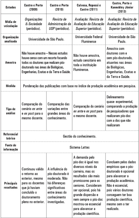 O artigo de Castro e Porto(2008), publicado na revista Organizações e Sociedade, parece ser pioneiro, abrindo com êxito um campo de pesquisa até então não explorado. Castro e Porto(2010) e Calvosa, Repossi e Castro(2011) acabam seguindo a mesma linha desse primeiro paper, apresentando em seus trabalhos um mesmo "fio condutor" no que diz respeito às investigações empíricas, pois utilizam o mesmo método para a mensuração com pesos e ponderações para os diversos tipos de produção bibliográfica e analisam o fenômeno pós-doutoral à luz do referencial teórico da Gestão do Conhecimento. De comum em todos os artigos, há o balanço de que a atual conjuntura impulsiona a valorização dessa capacitação docente, o que confere relevância à análise do valor final dessa qualificação, estabelecendo motivação para a pesquisa e a busca de aferição dos seus resultados.