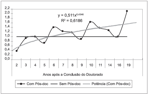 A Figura 2, extraída de Castro, Porto e Kannebley Júnior (2013),demonstra que, em vários momentos, os docentes com pós-doutorados realizados possuem produção científica nos mesmos patamares ou até mesmo abaixo da produção dos pesquisadores que não realizaram pós-doutorado ( linha constante ilustrada na figura - sendo mais visível essa relação nos pontos de 2, 5 e 9 anos após a obtenção do título de doutor) e isso aconteceu sistematicamente para os recém-doutores (considerados até cinco anos de conclusão do doutorado), entretanto, também ocorreu, em menor grau, com doutores seniores, sobre os quais os dados empíricos apontaram que os pares com e sem pós-doutorado, aos nove e aos dezesseis anos após a conclusão do doutorado, possuíam produção equivalentes. Ou seja, sendo o pós-doutorado não se mostra essencial para essa diferenciação na carreira.