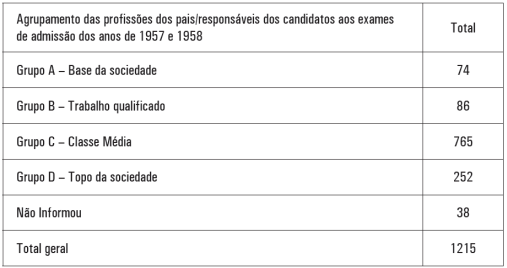 De forma a ter um retrato mais preciso da origem social e escolar dos alunos candidatos a uma vaga no colégio, buscamos traçar seu perfil. Tomamos como amostra os dados sobre os candidatos em dois exames de admissão: os realizados para o 1º ginasial de 1957 (500 candidatos) e de 1958 (715 candidatos), perfazendo 1.215 candidatos, tendo sido 961 rapazes e 240 moças 14. Podemos inferir que, como o candidato só poderia inscrever-se numa única escola, a alta seletividade do Colégio Estadual já determinava que possíveis candidatos optassem por outras instituições onde as chances de aprovação fossem maiores. Ou seja, a decisão de inscrição no Estadual já constituía parte do processo seletivo.