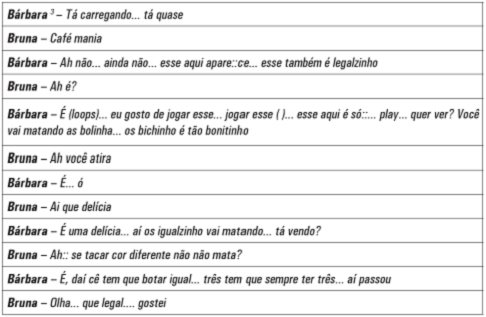 Assim sendo, foi possível verificar uma tendência nas formas de participação das alunas-professoras. Nos quadros a seguir, temos exemplos de interação entre o ministrante do curso, Gabriel, e/ou os demais participantes, professores em formação continuada. Constatamos que o agir espontâneo (AE) é marcadamente digressivo, ou seja, só ocorre quando o assunto tratado pela dupla é totalmente alheio às atividades propostas ou ao podcast propriamente dito. Segue um trecho de transcrição 2 onde o AE ocorre: