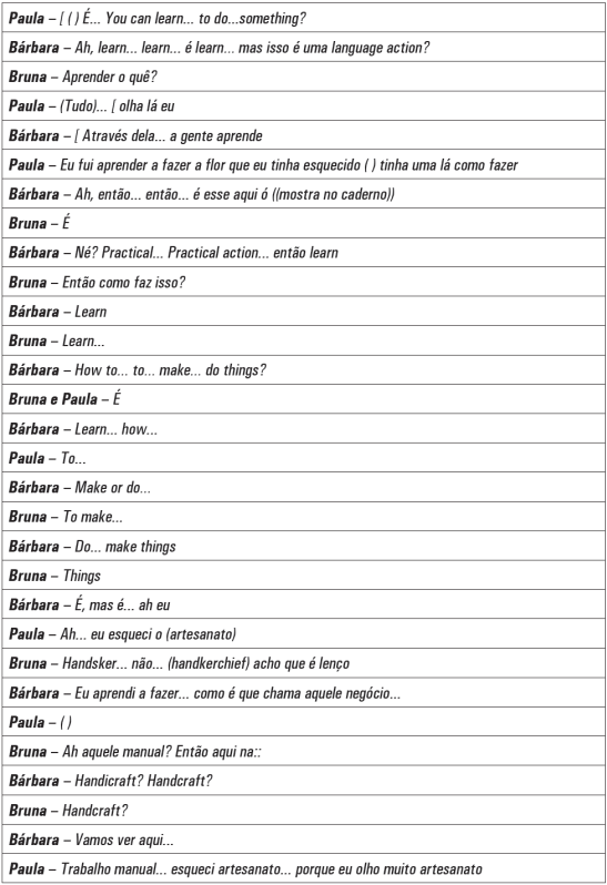Já o ARE ocorre em toda vez que as participantes retomam conhecimentos anteriores e procuram participar de forma mais ativa e crítica na resolução de exercícios ou quando da execução das tarefas solicitadas pelo ministrante. No trecho a seguir, as professoras executam uma tarefa proposta pelo material didático, em que discutem sobre "aprender a fazer algo" ( learn to do something) ser uma ação de linguagem ( language action) ou uma ação prática ( pratical action) propiciada por vídeos do YouTube. Paula ressalta a importância desse gênero como um facilitador na execução da produção de artesanato ( handcraft), elemento que faz parte do seu cotidiano: