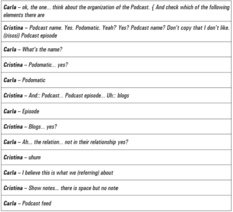 As ocorrências do agir responsivo restrito (ARR) são maiores quando o professor solicita a execução de alguma tarefa proposta pelo material didático que deve ser feita em pares ou pequenos grupos. O Quadro 3 mostra as professoras discutindo a organização ( organization) do podcast: