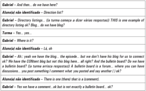 ABSTRACT: This paper aimed to analyze the interaction between English teachers in continuing education and the media podcast as a tool in the process of teaching and learning English language. The data analyzed is derived from the transcription of a course focused on the use of technology applied to foreign languages' teaching. Our study is based on Bronckart's Social Discursive Interactionism and on the implications from the use of new technologies as tools that stimulate social participation. In a broader context, the interaction among the in-service teachers was based on Sinclair and Coulthard's IRA sequences. At the level of the context of production, the participants' acts were classified according to three categories. The results show that there is little engagement from the teachers, as they rarely initiate IRA sequences. In addition, the data reveal the existence of resistance in the teachers' learning concerning the "new technologies" issue.