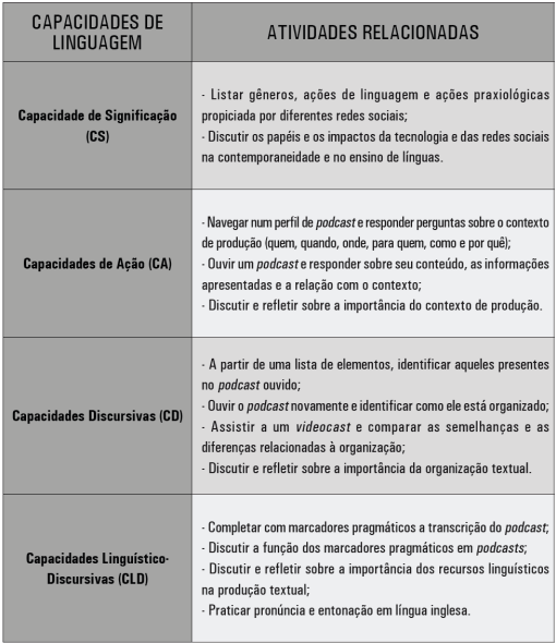 O Quadro 6 apresenta detalhadamente as atividades contempladas de forma separada por cada uma das quatro capacidades de linguagem, sendo que, nas atividades de produção do podcast, todas essas capacidades foram articuladas, atuando em conjunto na elaboração do produto final em questão.