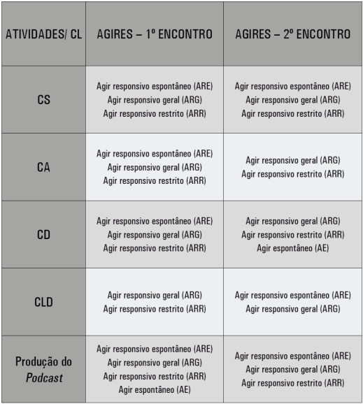 Ao se analisar a tabela, percebe-se que a única atividade em que os agires foram idênticos em ambos os encontros foram nas de CS. Outra semelhança é o fato de que só houve AE nos encontros em apenas um tipo de atividade. Além disso, embora a presença de ARE tenha sido maior que a de AE, nos dois encontros, a ocorrência de ARE não se deu em todas as atividades contempladas pelo material didático, o que reflete engajamento baixo ou nulo por parte das participantes durante as atividades em que o ARE não ocorreu.