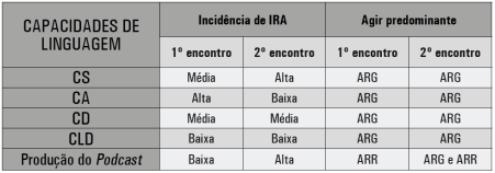 Elaboramos outro quadro a fim de delinear um panorama mais amplo, retomando o contexto macro, a partir da incidência de sequências IRA e também estabelecendo um paralelo entre as sequências e o agir predominante em cada capacidade de linguagem privilegiada no desenvolvimento das tarefas propostas.