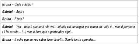Tomando como base a premissa de que o conflito gera reflexão e que esta, por sua vez, provoca tomada de consciência (condição fundamental para o desenvolvimento), percebemos um momento particular do encontro em que Bruna, no fim de todo o processo, refletiu sobre o seu conhecimento relativo às TDIC e afirmou "querer aprender" a lidar com os procedimentos de postagem online do podcast: