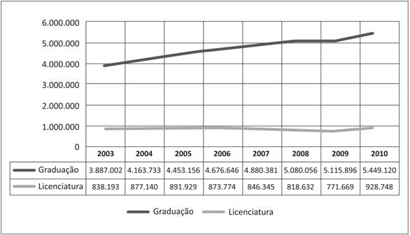 Em 2003 foram registradas 3.887.022 matrículas em cursos de graduação e 838.193, em cursos de licenciatura; estas últimas, percentualmente, representavam 21,6% do total das matrículas. No ano de 2010, as matrículas nos cursos de graduação chegaram a 5.449.120 e, em cursos de licenciatura, 928.748, o que representava, percentualmente, 17,1% do total de registros nesse ano. Se for tomado como referência o período analisado (2003-2010), o crescimento das matrículas nos cursos de licenciatura foi de apenas 10,8%, enquanto o das matrículas nos cursos de graduação em geral foi de 40,2%.