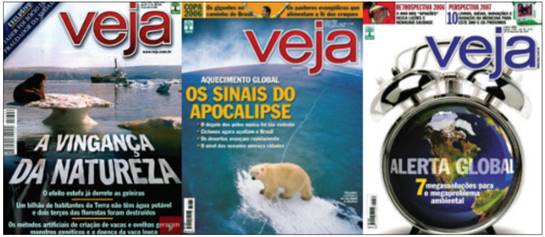 As análises que seguem dão visibilidade ao medo que se instaura referente à crise ambiental vivida por nós a partir de algumas reportagens da revista Veja. Destacamos que este estudo, que compõe uma tese de doutorado, dedicou-se a analisar as reportagens de capa que tratassem da questão ambiental no período de 2001 até 2012. Assim, chegamos a um recorte de 14 reportagens que versavam, como chamada de capa, sobre alguma temática atrelada ao campo ambiental. Dadas essas primeiras balizas, passemos às discussões!