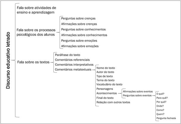 O discurso que caracteriza esse tipo de práticas alfabetizadoras é reconhecível pela referência às formas e aos significados dos textos e, por isso, aos processos mentais, cognitivos e linguísticos que são necessários para compreender e produzir a linguagem. É próprio da fala sobre textos escritos citar ou parafrasear o escrito para comentá-lo e interpretá-lo, isto é, para pensar no que quer dizer, seu significado e sentido (OLSON, 1994). Essas atividades discursivas requerem o uso de abundante terminologia metacognitiva e metalinguística e, de fato, a quantidade e diversidade de verbos que se referem atividades cognitivas e linguísticas constituem um indicador do caráter letrado do discurso (ASTINGTON; OLSON, 1990; TEBEROSKY; et al., 2006; TORRANCE; OLSON, 1987; WATSON, 1996, 2002).