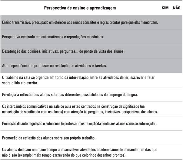 Nota: em cor cinza destacamos as linhas referentes a comportamentos que podem caracterizar o perfil diretivo/transmissivo e em branco os comportamentos correspondentes ao perfil interativo/construtivo. A prevalência de uns sobre outros nos ajudou a identificar o perfil das professoras. Fonte: Elaboração própria.