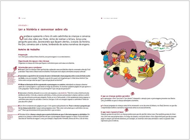 As ações mais distantes foram as das professoras do Mato Grosso no segmento anterior à leitura. A professora de perfil diretivo/transmissivo (MT-D) apresentou o livro, mostrando a capa e focando o trabalho de estimular antecipações em torno da seguinte questão: A história se chama: “Os sete cabritinhos”, mas nós vamos descobrir por que aqui na capa tem oito cabritinhos − questão pouco afortunada que não conseguiu cumprir a função de pergunta-guia procurada pela professora. Ao mostrar as ilustrações do livro para as crianças, ela não fez comentários ou levantou questões e passou diretamente à leitura em voz alta. Diferentemente, a professora de perfil interativo/construtivo (MT-I) realizou, antes da leitura, uma extensa atividade de conjectura e formulação de antecipações, a partir da visualização das ilustrações de cada uma das páginas duplas do livro.