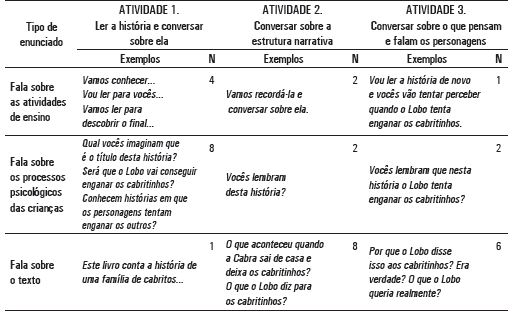 a) Fala sobre as atividades de ensino e aprendizagem (foco na atividade conjunta). Enunciados que se referem às ações realizadas pelo professor e pelos alunos em torno de, a partir de ou sobre o texto. Foram codificados nessa categoria enunciados como: hoje vamos ler...; vamos recordar a história...; vou perguntar para vocês...; eu vou ler e depois conversamos...
