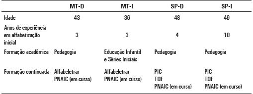 Participaram quatro professoras do primeiro ano do Ensino Fundamental pertencentes às equipes docentes de duas escolas públicas, uma localizada no estado de São Paulo e a outra no estado de Mato Grosso, nas cidades de São Paulo e Juína respectivamente. São escolas que tinham recebido a coleção Trilhas, mas que ainda não a tinham usado.
