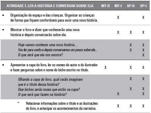 A primeira análise consistiu em verificar a apropriação e o uso das orientações expostas no material educativo. Para isso, elaboramos um inventário de ações que reproduz as instruções dadas às professoras para o desenvolvimento da Atividade 1. “Ler a história e conversar sobre ela”, expostas no roteiro de trabalho do Caderno de orientações utilizado na pesquisa.