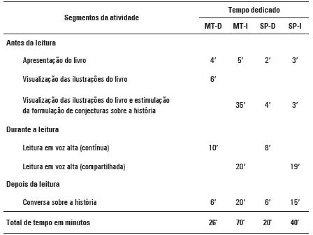 Os dados relativos à identificação dos segmentos de atividade e ao uso do tempo mostram importantes diferenças e semelhanças entre os perfis e as professoras. Tanto no caso das professoras do Mato Grosso quanto no caso das professoras de São Paulo, o perfil interativo/construtivo dedicou o dobro do tempo para realizar as mesmas atividades. Na Tabela 1 observamos que as professoras de perfil diretivo/transmissivo coincidiram no tipo de leitura em voz alta realizada, uma leitura contínua, sem estimulação da participação das crianças; enquanto as professoras de perfil interativo/construtivo realizaram leituras compartilhadas e reconstruíram a história, depois de lida, por meio de numerosas questões.