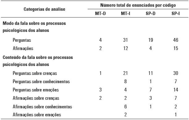 Uma vez estabelecido e aplicado esse primeiro sistema de categorias, realizamos sucessivos processos de codificação dos diferentes subconjuntos de dados que íamos obtendo. Assim, no caso do conjunto de enunciados categorizados como fala sobre os processos psicológicos dos alunos, contabilizamos duas distinções, uma referente ao modo predominante do enunciado e outra ao seu conteúdo. Em relação ao modo, observamos que, quando uma professora focava os processos psicológicos dos alunos, o fazia por meio de perguntas ou de afirmações que podiam ter relação com três tipos de conteúdos psicológicos: crenças, conhecimentos ou emoções. A definição dessas categorias e subcategorias utilizadas para codificar a fala sobre os processos psicológicos dos alunos foram: