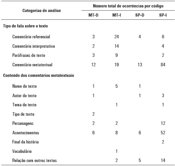 O predomínio de comentários metatextuais levou-nos a indagar qual seria o seu conteúdo − o que as professoras disseram sobre os textos? Ainda na Tabela 4, expomos os resultados da análise de conteúdo desse subconjunto específico de dados. Observamos que, na maioria das vezes, foram referências aos acontecimentos ou eventos narrados na história; essa referência foi seguida, apenas no caso das professoras de São Paulo, da fala sobre a relação do texto lido com outros textos (intertextualidade). Em menor medida, encontramos referências aos personagens da história e, quase que com ocorrências únicas, as informações relativas ao título e ao autor do texto, ao tema ou assunto da história (MT-D; SP-I), ao tipo de texto (MT-D), ao final da história (SP-I) e ao vocabulário (MT-I).