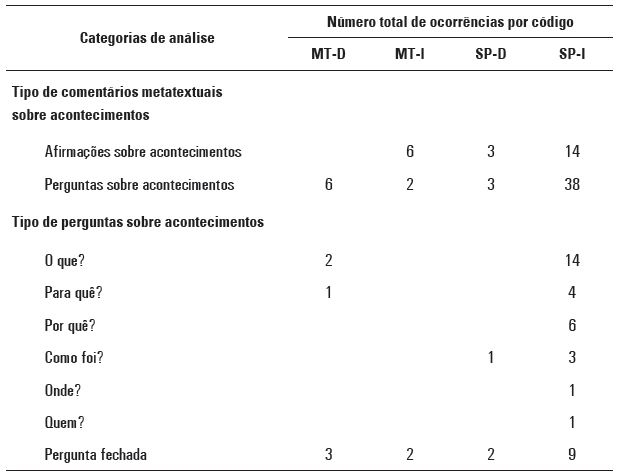 O estudo do subconjunto de dados comentários metatextuais referidos aos acontecimentos mostrou que, em quase todos os casos, tratou-se de perguntas e, em menor medida, afirmações (ver Tabela 5). No caso da professora MT-I, houve mais afirmações sobre os acontecimentos do que perguntas. Destacamos também a quantidade de perguntas formuladas pela professora de perfil interativo/construtivo de São Paulo (mais que o dobro, se comparada com a quantidade de afirmações). Em relação à variedade de questões, a Tabela 5 mostra que a professora de perfil interativo/construtivo de São Paulo se diferenciou de forma significativa das demais. As professoras do Mato Grosso e a professora de perfil diretivo/transmissivo de São Paulo (SP-D) fizeram, em maior medida, perguntas fechadas (que levam a afirmar ou negar informações dadas sobre os eventos) enquanto a professora interativa/construtiva de São Paulo utilizou uma ampla variedade de questões.