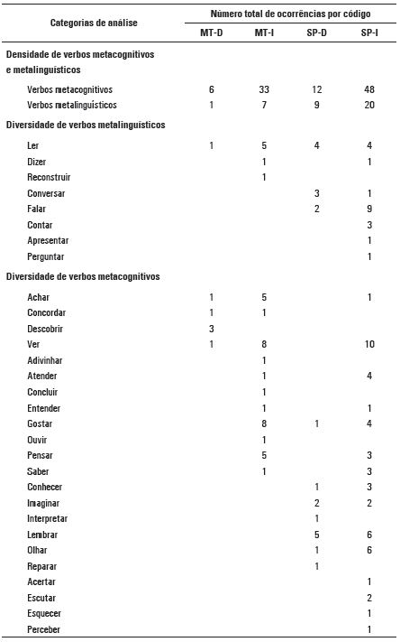 Esta análise mede a quantidade e o tipo de verbos sobre ações mentais e linguísticas presentes no discurso das professoras. Trata-se de uma medida usada em estudos relativos à fala sobre textos (ASTINGTON; OLSON, 1990; TORRANCE; OLSON, 1987; WATSON, 1996) e sobre o discurso letrado na sala de aula (Teberosky et al., 2006).