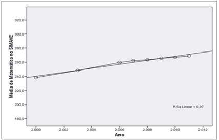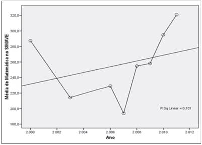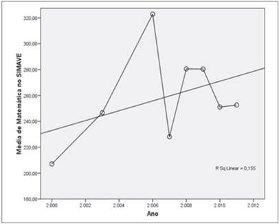2) Haverá, para as escolas do Simave, uma tendência significativa de variação das médias de proficiência ao longo do tempo? Em caso afirmativo, seria possível estimar seu valor?