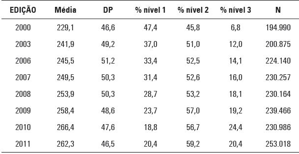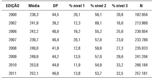 O presente estudo considerou apenas os resultados da 8ª série/9º ano do Ensino Fundamental (EF), para o qual se apresentam, a seguir, algumas estatísticas descritivas de proficiência divididas por ano de edição do Proeb/Simave. Os alunos avaliados no Proeb são classificados em três níveis de proficiência: Baixo (nível 1), Intermediário (nível 2) e Recomendado (nível 3).