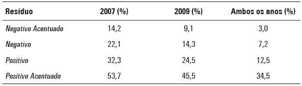 A tabela a seguir indica o percentual de escolas que não conseguiram atingir suas respectivas metas do Ideb associado ao tipo de resíduo de desempenho. Há colunas para os anos de 2007 e 2009, separadamente, e para o caso do não cumprimento verificado em ambos os anos.