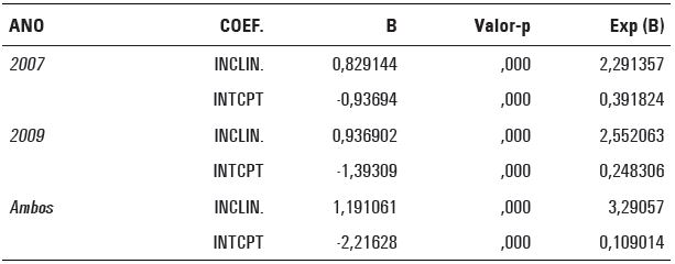 Observa-se, pela Tabela 11, que todos os coeficientes da regressão são significativos. Uma informação particularmente relevante encontra-se na última coluna - Exp (B) - e, nas linhas das inclinações, significa a variação nas chances de uma escola não atingir o Ideb associada a um aumento de desvio-padrão na variável do desvio entre as notas reais e as previstas em 2005 na Prova Brasil. Dessa forma, percebe-se que, para cada desvio-padrão a mais que a escola avança quanto à volatilidade de seus resultados médios, suas chances de não atingir a meta do Ideb em 2007 aumentaram cerca de 2,3 vezes. Esse efeito ainda subiu ligeiramente em 2009 - para aproximadamente 2,6 - e chegou a cerca de 3,3 vezes, nos casos das escolas que não atingiram o Ideb em nenhuma das edições.