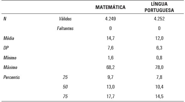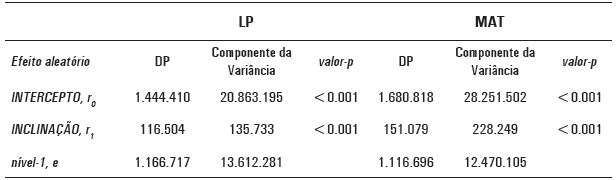 Neste ponto, cabe lembrar que a resposta à primeira pergunta é fornecida na linha do efeito aleatório do intercepto (r0 ), onde se informa que são extremamente baixos os valores p para a variância dos resultados do teste no nível das escolas. Em outras palavras, há uma variância não nula para as diferenças entre as proficiências médias das escolas públicas de Minas Gerais, tanto para os resultados de Língua Portuguesa quanto para os de Matemática, o que implica algumas delas terem se saído significativamente melhor do que outras no teste de 2011.