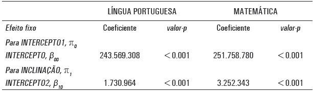 Por sua vez, a resposta para a terceira pergunta pode ser encontrada também na tabela das variâncias apresentada (TABELA 3). É possível ver, na linha do parâmetro de inclinação, que a resposta a essa pergunta é positiva, tanto para Língua Portuguesa quanto para Matemática: as escolas do Simave diferem-se umas das outras quanto à taxa de evolução de suas respectivas médias de Língua Portuguesa, visto que, novamente, é aproximadamente nulo o valor p para a variância dessas taxas no nível das escolas.