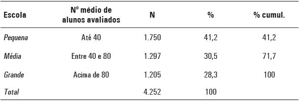 A observação da distribuição das escolas quanto ao número de alunos avaliados permite-nos, para fins de descrição e análise dos dados, dividir convencionalmente essa escala em três níveis, que são os apresentados na Tabela 6.