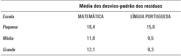 Cabe investigar como a volatilidade dos resultados se apresenta para os diferentes tamanhos de escolas. Para isso, para cada um dos três grupos de escolas - pequenas, médias e grandes -, obteve-se a média dos seus respectivos desvios-padrão dos resíduos, que correspondem à medida de volatilidade aqui considerada. Os resultados foram: