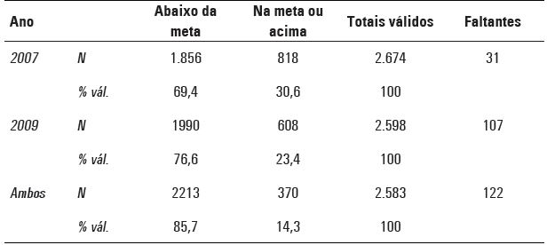 A tabela a seguir mostra o percentual das escolas consideradas na amostra que se encontraram abaixo de suas metas para o Ideb nos anos de 2007 e 2009.